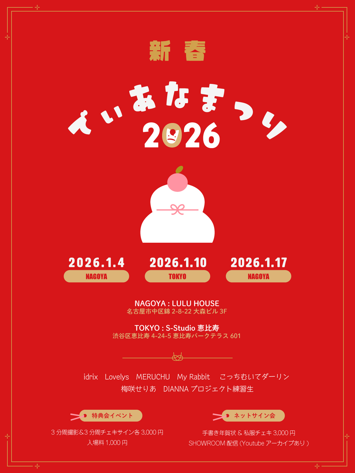 idrix / Lovelys / MERUCHU / My Rabbit / こっちむいてダーリン / 梅咲せりあ / DIANNAプロジェクト練習生(名古屋&東京)